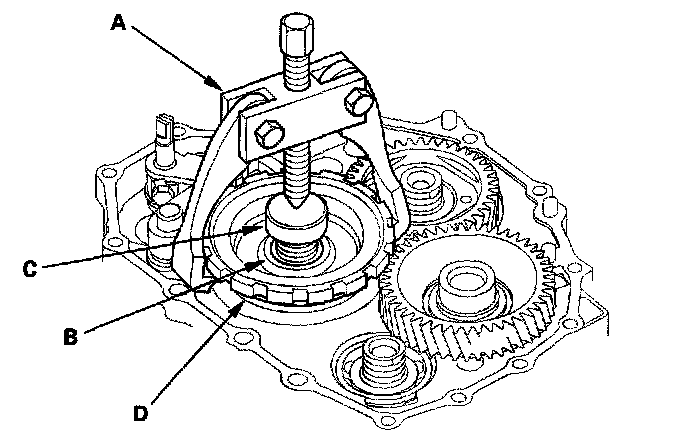 13. Set a two-jaw (or three-jaw) puller (A) on the countershaft (B) by putting a spacer (C) between the puller and countershaft, then remove the park gear (D).
