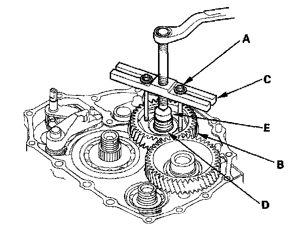14. Install 6 x 1.0 mm bolts (A) on the mainshaft idler gear (B). Set a puller (C) on the mainshaft (D) with putting a spacer (E) between the puller and mainshaft, then remove the mainshaft idler gear.