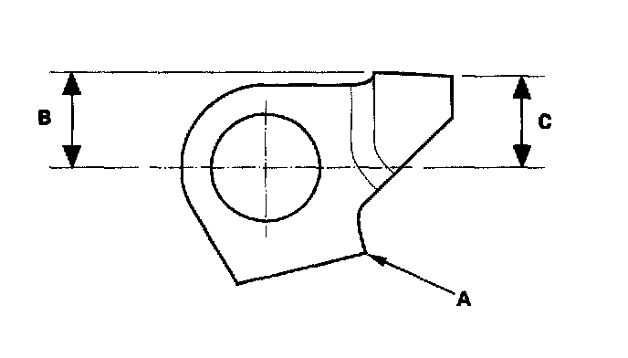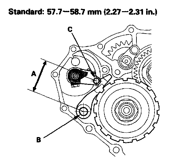 2. Measure the distance (A) between the park pawl shaft (B) and the park lever roller pin (C).