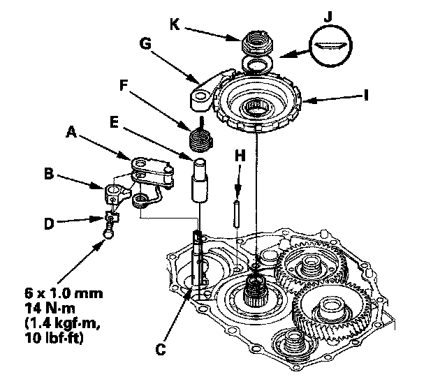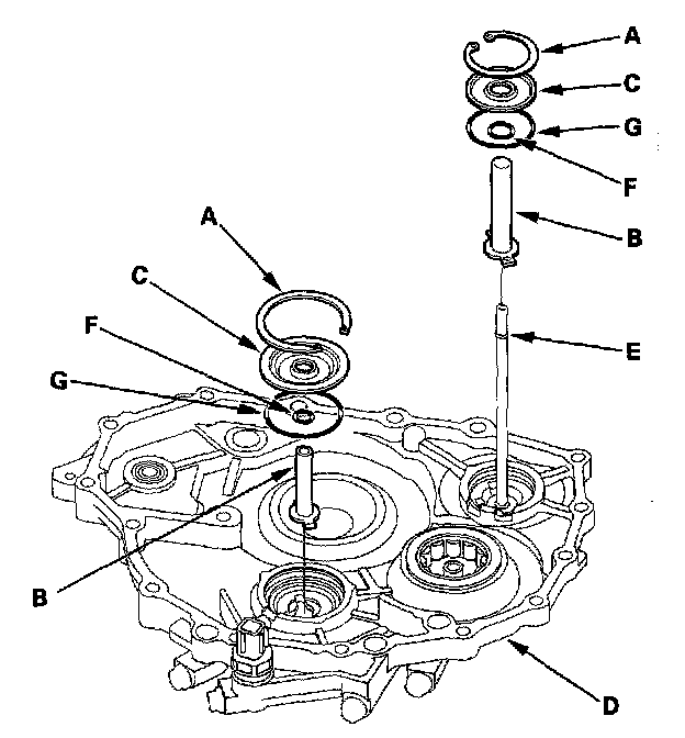 5. Install the park pawl shaft (E), park pawl spring (F), park pawl (G), and stop shaft (H) on the transmission housing.