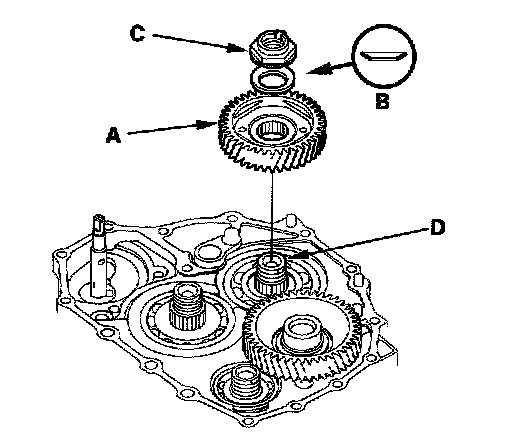 3. Install the mainshaft idler gear (A), old conical spring washer (B), and old locknut (C) on the mainshaft (D), and tighten the locknut to 226 Nm (23.0 kgf-m, 166 ft. lbs.).