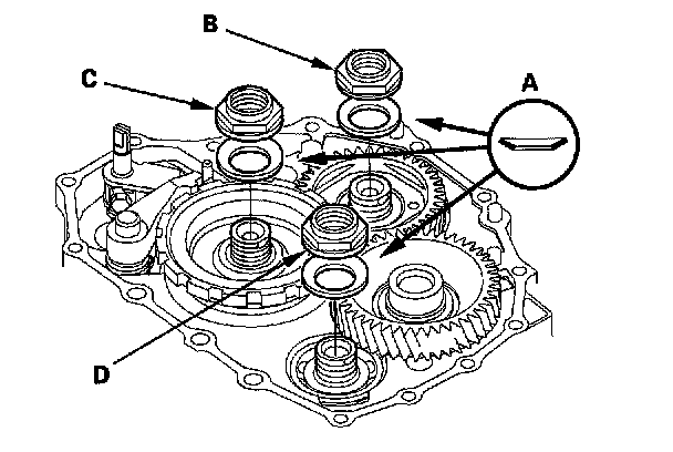11. Install the new conical spring washers (A) with the stamped mark side facing in the direction shown, and install the new mainshaft locknut (B), the new countershaft locknut (C), and the new secondary shaft locknut (D).