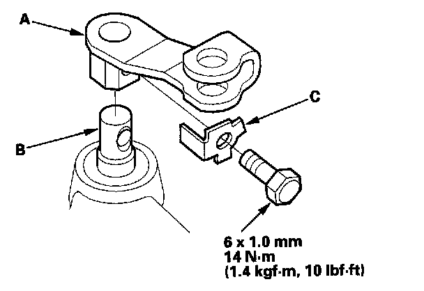 15. Install the control level (A) on the selector control shaft (B), and install the bolt with the new lock washer (C), then bend the lock tab of the lock washer against the bolt head.