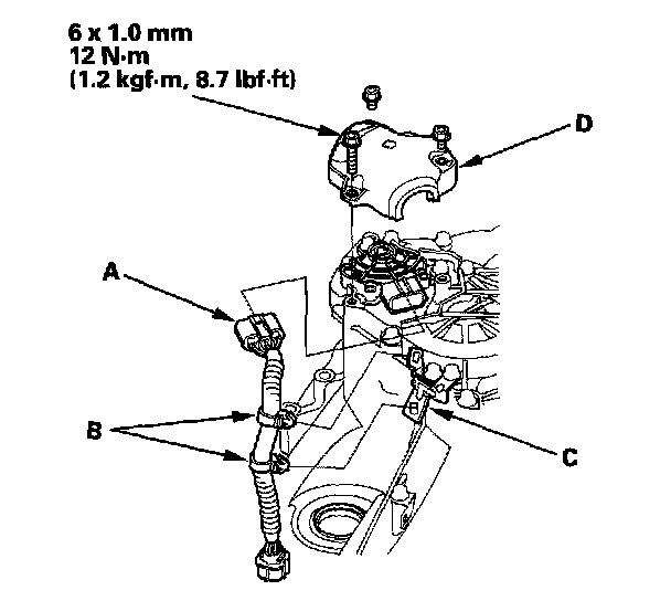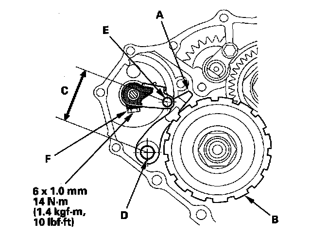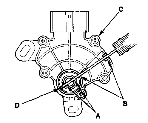 24. Align the cutouts (A) on the rotary-frame with the neutral positioning cutouts (B) on the transmission range switch (C), then put a 2.0 mm (0.08 inch) feeler gauge blade (D) in the cutouts to hold in the N position.