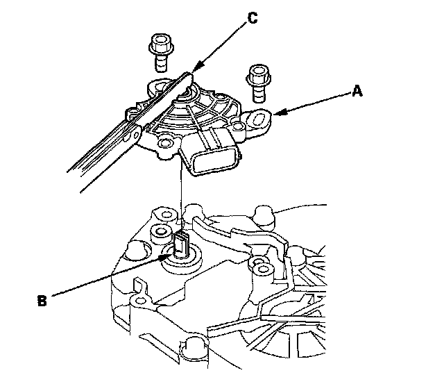 25. Install the transmission range switch (A) gently on the selector control shaft (B) while holding it in the N position with the 2.0 mm (0.08 inch) blade (C).