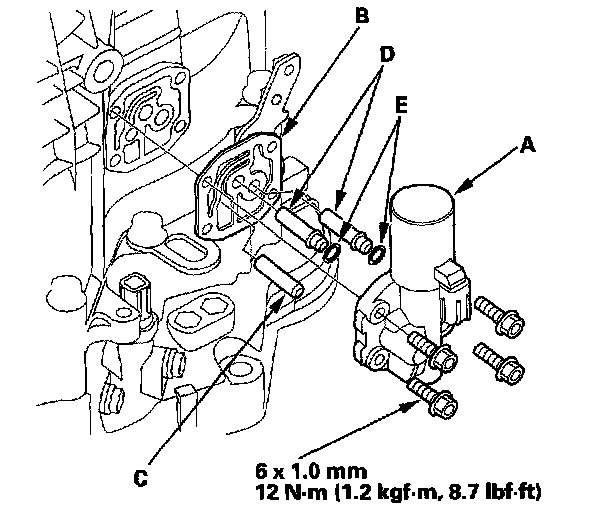 34. Install the ATF filter bracket (A) on the transmission housing, then install the ATF cooler line/ATF filter (B) with the line bolt (C) new sealing washers (D). Secure the ATF filter with its bracket (E).