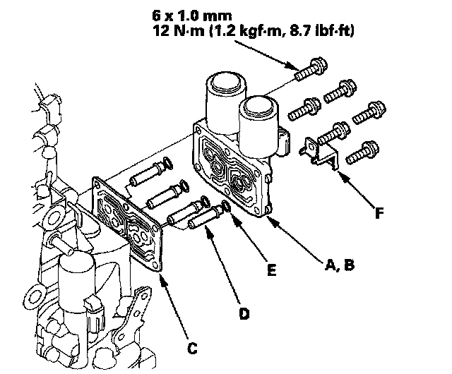 32. Install A/T clutch pressure control solenoid valves A and B, and harness clamp bracket (F).