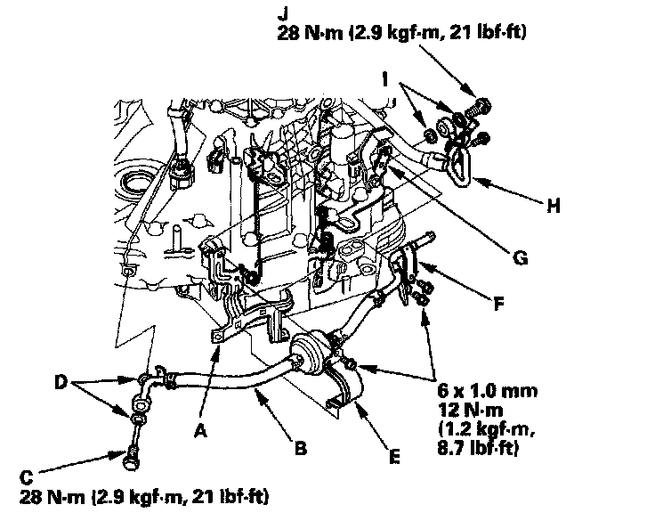 36. Install the ATF cooler outlet line (H) with the line bolt (I) and new sealing washers (J).