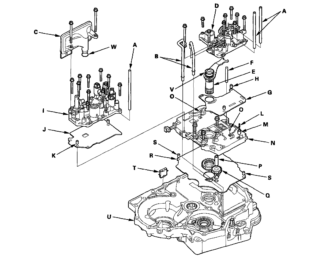 12. Remove the O-rings (V) (W) from the stator shaft and ATF strainer. Install the new ones when installing the valve bodies.