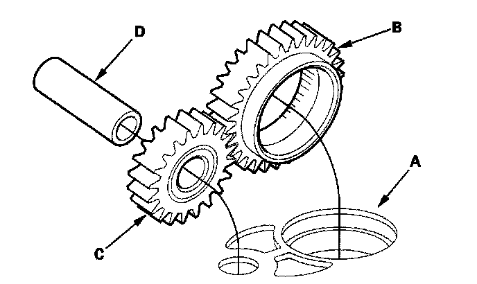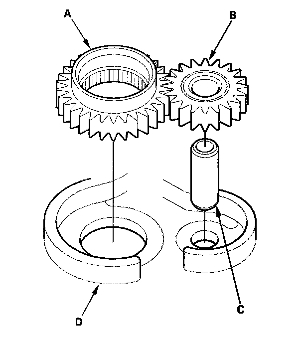 1. Install the ATF pump drive gear (A), driven gear (B), and ATF pump driven gear shaft (C) in the main valve body (D). Lubricate all parts with ATF, and install the ATF pump driven gear with its grooved and chamfered side facing up.