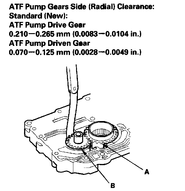 2. Measure the side clearance of the ATF pump drive gear (A) and driven gear (B).