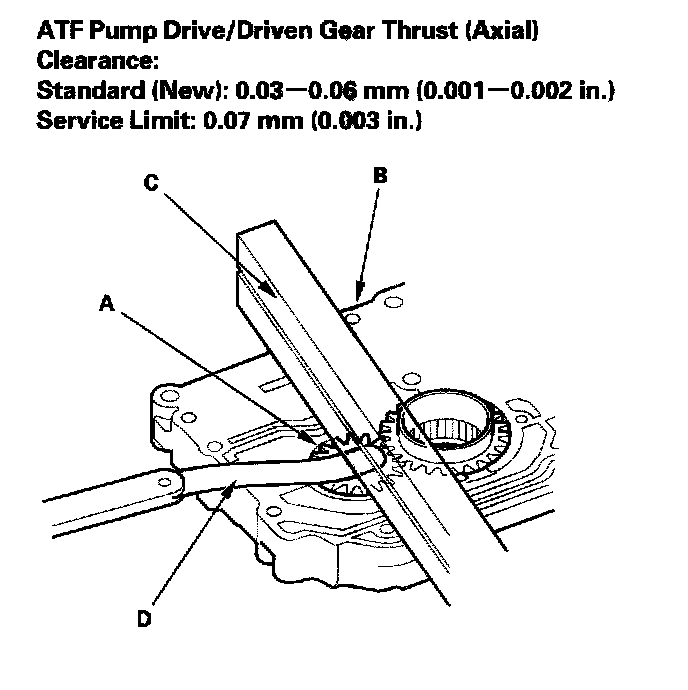3. Remove the ATF pump driven gear shaft. Measure the thrust clearance between the ATF pump driven gear (A) and the valve body (B) with a straight edge (C) and a feeler gauge (D).