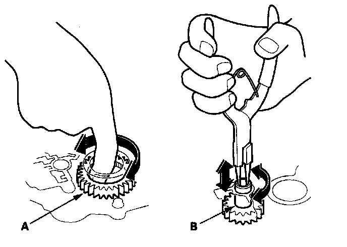 4. Make sure the ATF pump drive gear (A) rotates smoothly in the normal operating direction, and the ATF pump driven gear shaft (B) moves smoothly in the axial and normal operating direction.