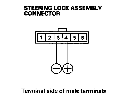 4. Connect the battery positive terminal to steering lock assembly connector terminal No. 4, and connect the battery negative terminal to No. 3 terminal. Make sure that the ignition key cannot be turned to LOCK (0) position. Release the battery terminals, and make sure that the key can be turned to LOCK (0) position and removed from the cylinder.