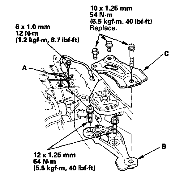 7. Remove the ground cable (A), transmission upper mount bracket (B), and bracket plate (C).