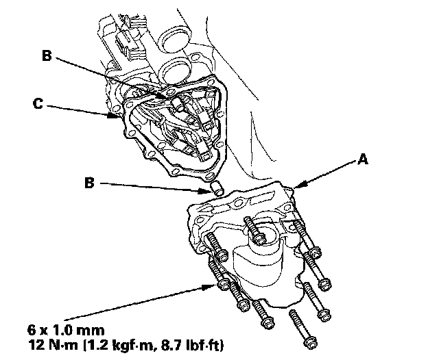 12. Remove the shift solenoid valve cover (A), dowel pins (B), and gasket (C).