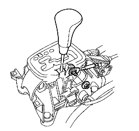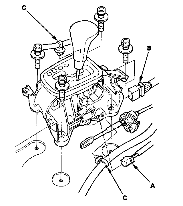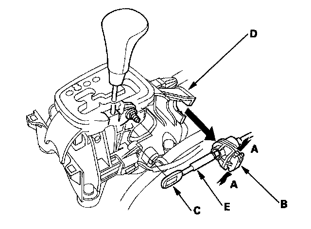4. Press the holder lock release (A), and pull out the socket holder (B) on the shift cable (C) of the shift lever bracket base (D). Do not remove the shift cable by pulling the shift cable guide (E).