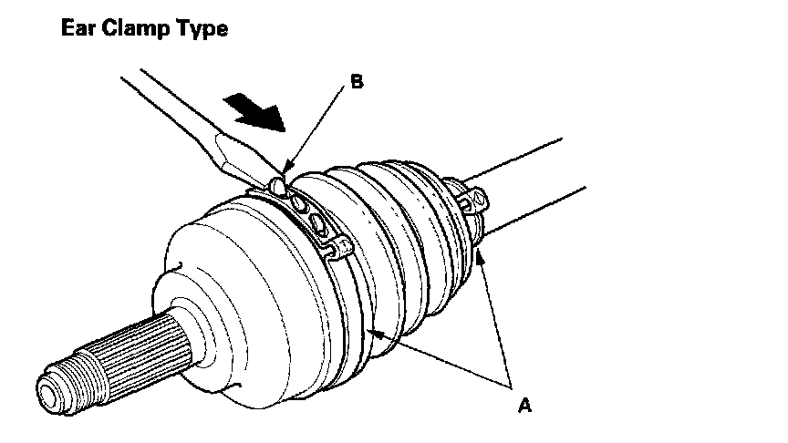 1. Remove the boot bands. Be careful not to damage the boot and dynamic damper. If the boot band is an ear clamp type (A), lift up the three tabs (B) with a screwdriver.