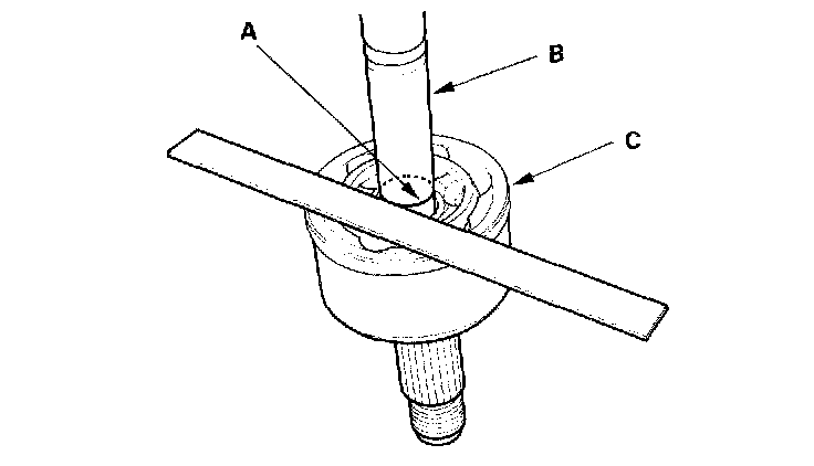 4. Make a mark (A) on the driveshaft (By at the same position of the outboard joint end (C).