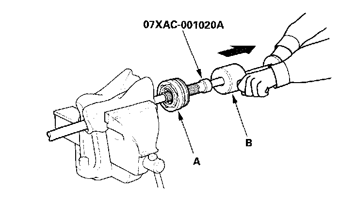 6. Remove the outboard joint (A) using the special tool and a commercially available 5/8" slide hammer (B).