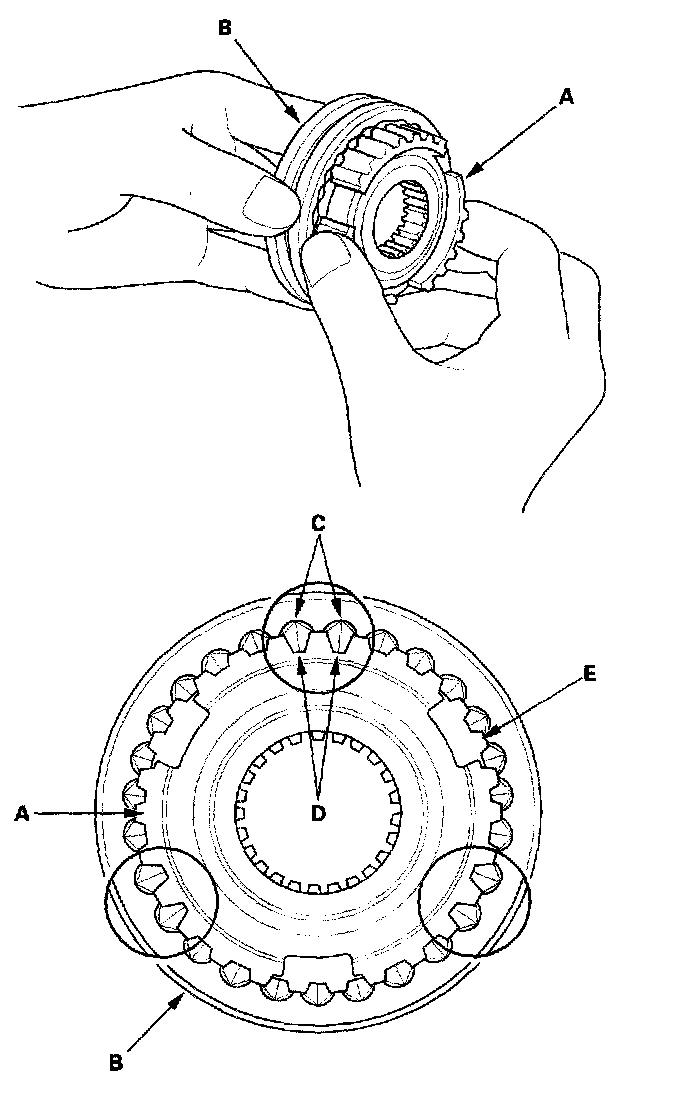 2. Install each synchro hub (A) in its mating synchro sleeve (B), and check for free movement. Make sure you match the three sets of longer teeth (C) (120 degrees apart) on the synchro sleeve with the three sets of deeper grooves (D) in the synchro hub. Do not install the synchro sleeve with its longer teeth in the slots of the 1st/2nd synchro hub (E) because it will damage the spring ring.