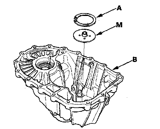 1. Remove the 72 mm shim (A) and oil guide plate M from the transmission housing (B).