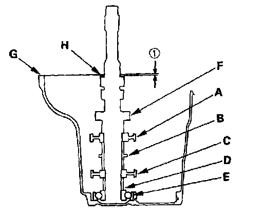 2. Install the 3rd/4th synchro hub (A), the distance collar (B), the 5th/6th synchro hub (C), distance collar (D), and ball bearing (E) on the mainshaft (F), then install the assembled mainshaft in the transmission housing (G).