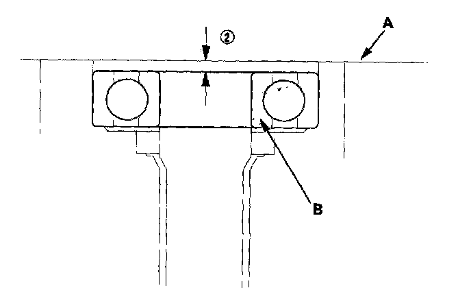 5. Measure distance (2) between the end of the clutch housing (A) and bearing inner race (B) with a straight edge and depth gauge. Measure at three locations, and average the readings.