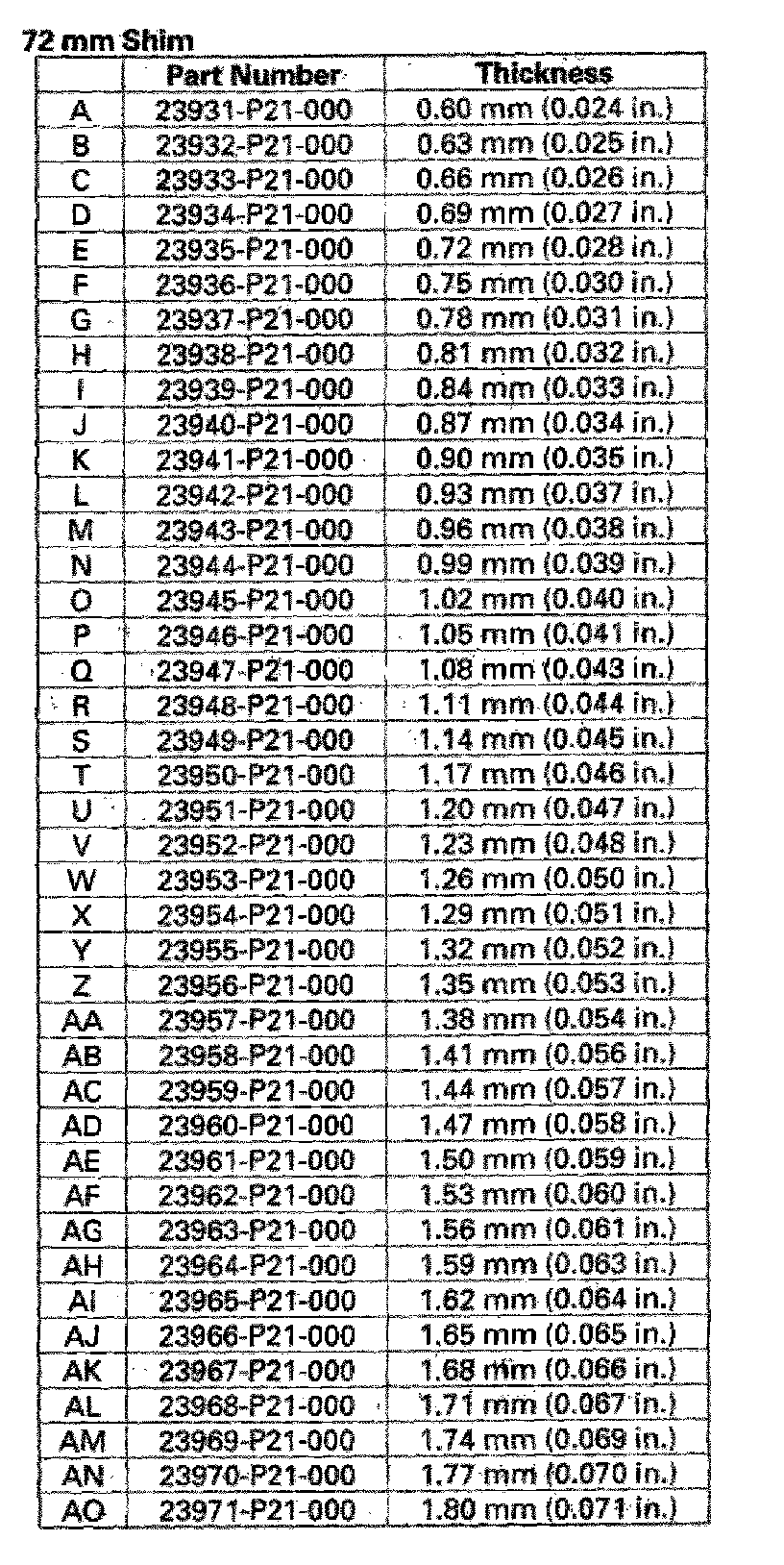 6. Select the proper 72 mm shim from the chart. Follow the example below, and use the measurements you made in steps 4 and 5: