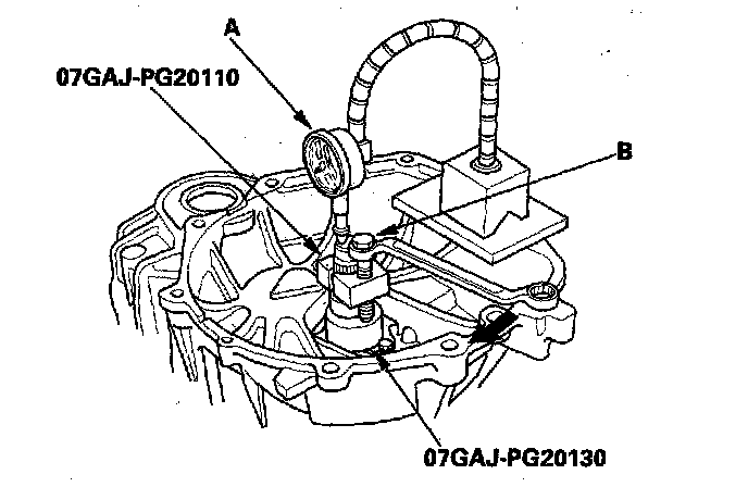 17. Turn the mainshaft holder bolt (B) clockwise; stop turning when the dial gauge (A) has reached its maximum movement. The reading on the dial gauge is the amount of mainshaft end play.