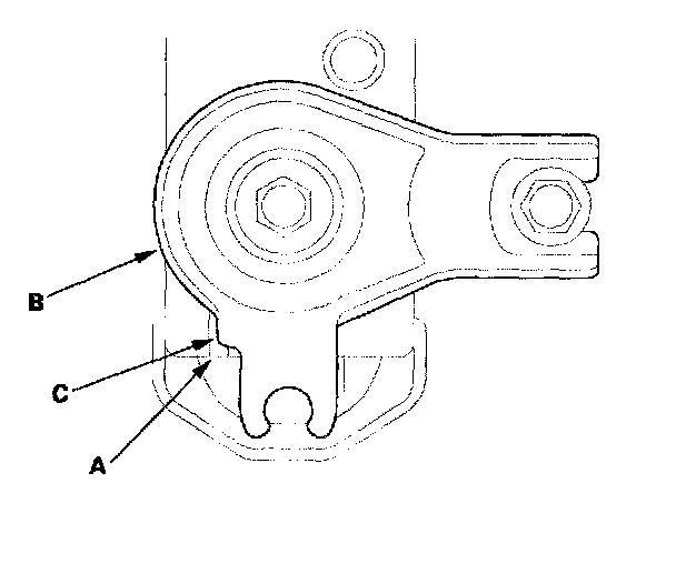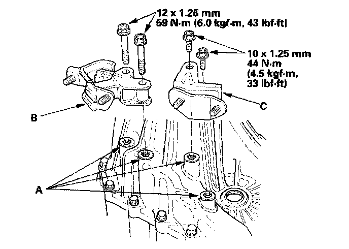 3. Check that the mount bracket collars (A) are installing the transmission, then install the transmission lower front mount (B) and transmission lower rear mount (C).