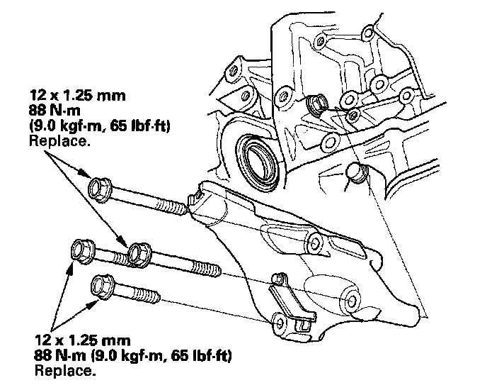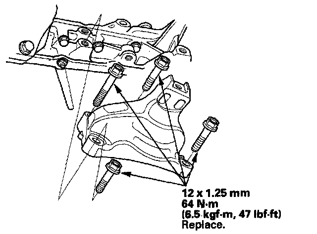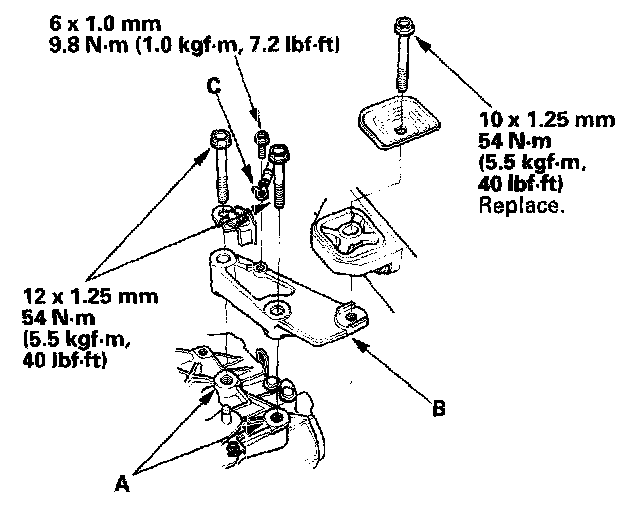 8. Install the rear engine mount (A), rear engine mount upper mounting bolt (B), and shift cable bracket (C).