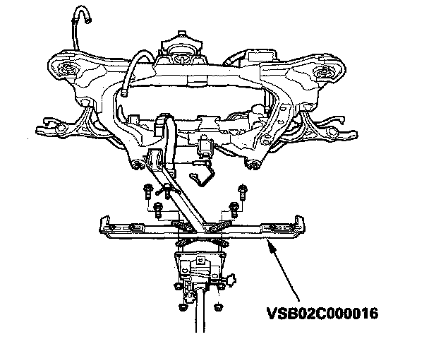 12. Align the reference marks (A) with edge (B) of both rear stiffer (C), and tighten the rear subframe mounting bolts, then the front bolts, and tighten the stiffener bolts to the specified torque.