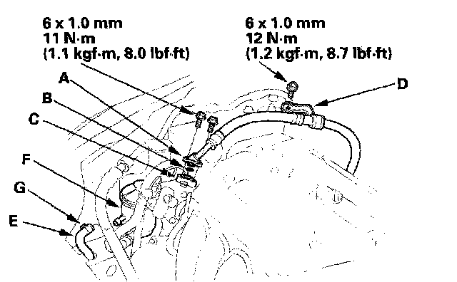 35. Connect the return hose (E) to the power steering fluid reservoir (F), then secure the hose with the clamp (G).