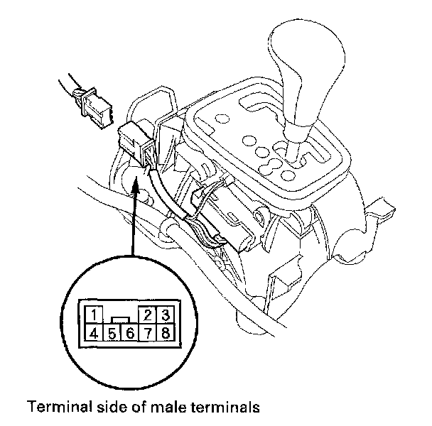 4. Check for continuity between connector terminals No. 7 and No. 2. There should be continuity when the shift lever is pushed toward the upshift position (+), and no continuity with the shift lever released to the neutral position.