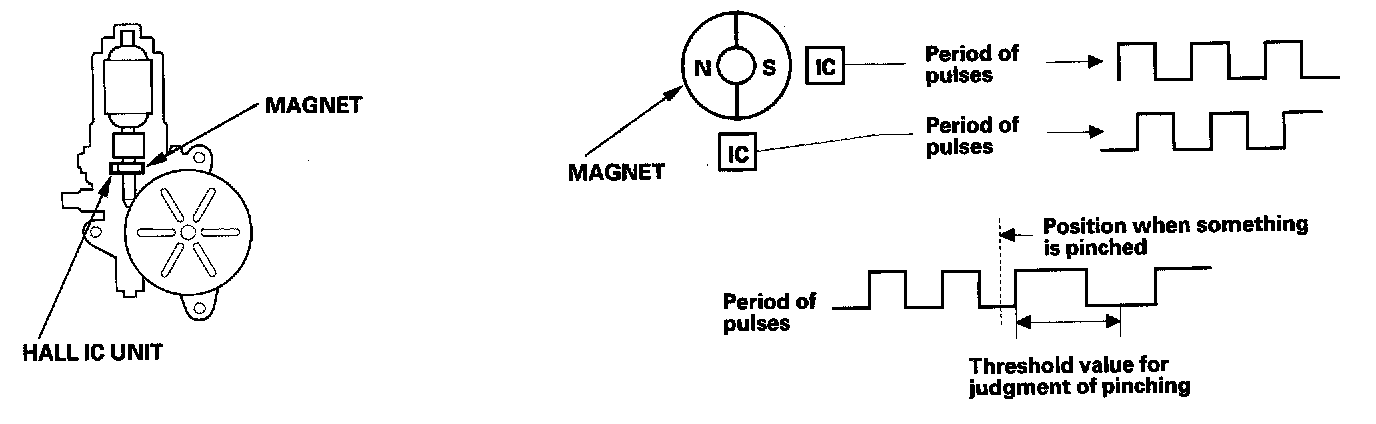 The system is composed of the power window master switch, the power window control unit and the driver's window motor. The power window motor incorporates a pulser which generates pulses during the motor's operation and sends the pulses to the power window control unit. As soon as the power window control unit detects no pulses from the pulser, the control unit makes the power window motor stop and reverse. This is to prevent pinching your hand or fingers during auto-up operation.