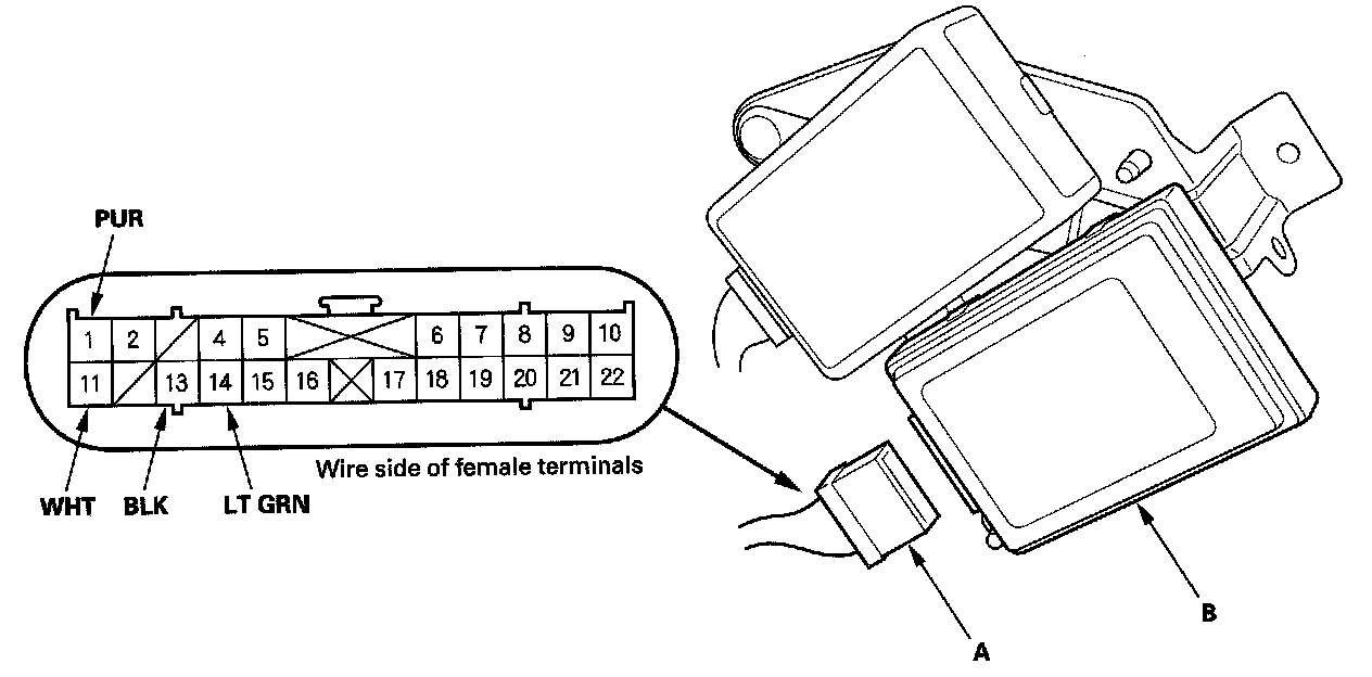 2. Disconnect the 22P connector (A) from the HandsFreeLink control unit (B).