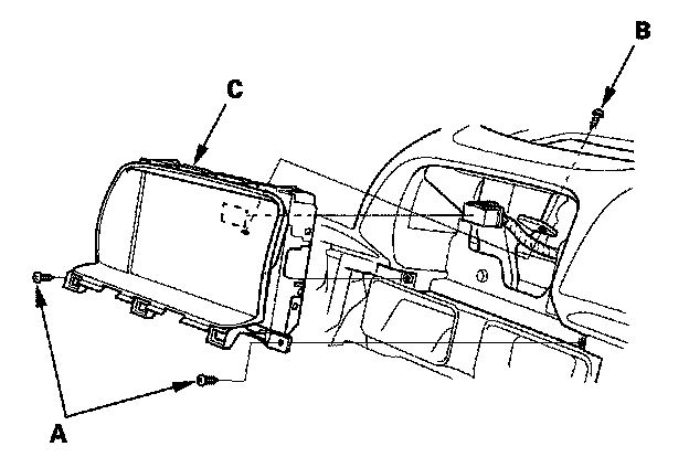 2. Remove the three screws (A, B), then remove the display unit (C). The forward screw (B) can be seen through the windshield or with a mirror.