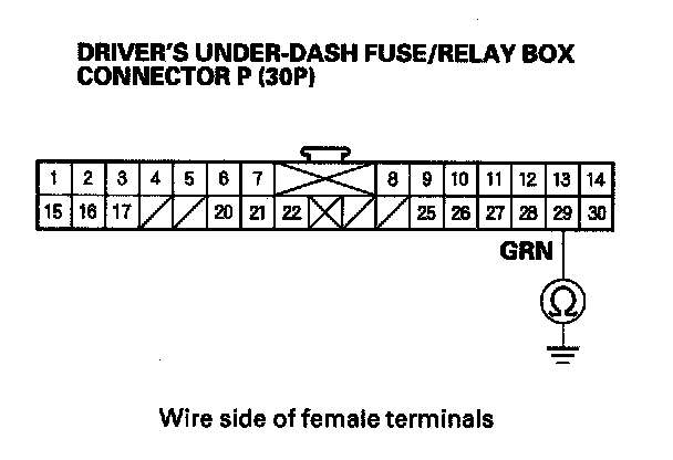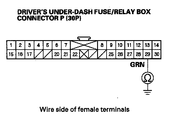 11. Check for continuity between driver's under-dash fuse/relay box connector P (30P) terminal No. 29 and body ground.