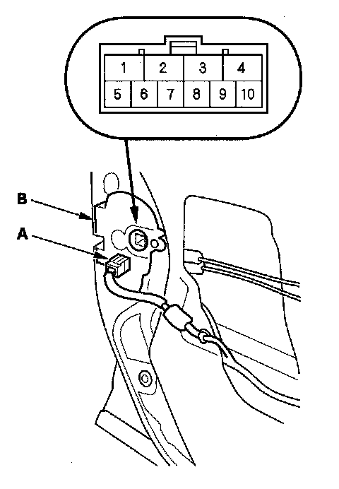 2. Disconnect the 10P connector (A) from the key cylinder switch (B).