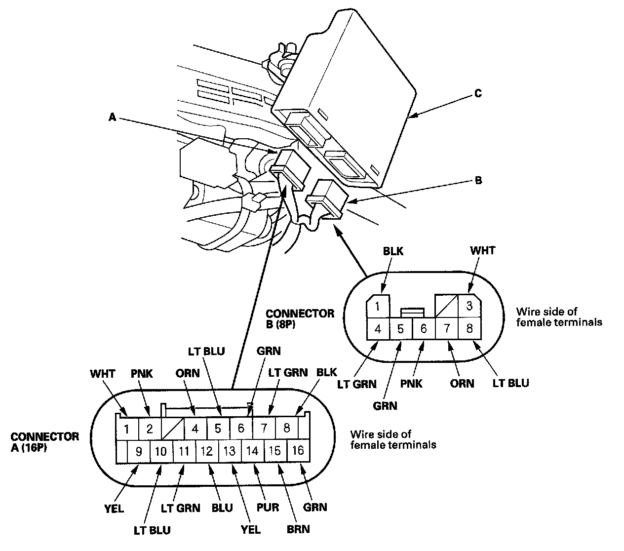 3. Disconnected the 16P connector (A) and 8P connector (B) from the power tilt/telescopic steering control unit (C).
