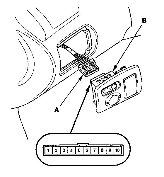 2. Disconnect the 10P connector (A) from the power mirror switch (B).