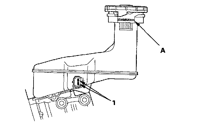 ^ Fill the reservoir with brake fluid to the MAX (upper) level (A). With the float up, there should be no continuity.