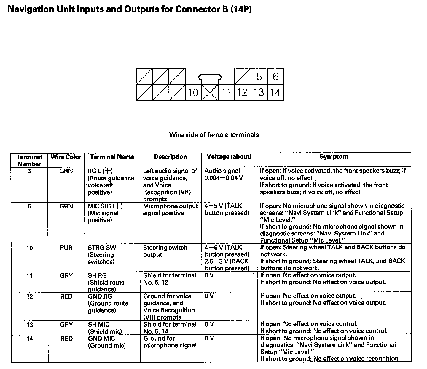 Navigation Unit Inputs And Outputs For Connector B (14P):