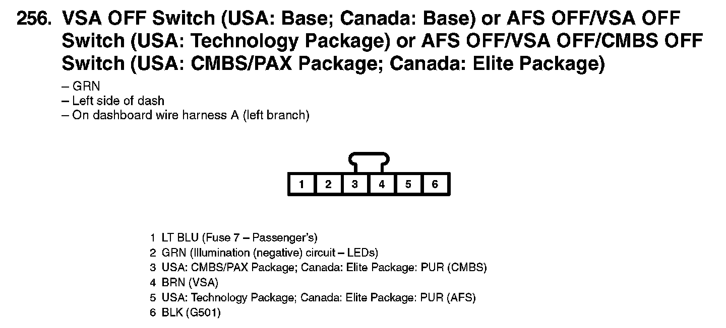 256. VSA OFF Switch (USA: Base; Canada: Base) Or AFS OFF/VSA OFF Switch (USA: Technology Package) Or AFS OFF/VSA OFF/CMBS OFF Switch (USA: CMBS/PAX Package; Canada: Elite Package):