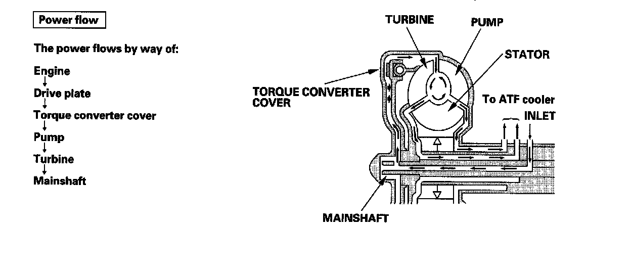 Lock-up SystemThe lock-up mechanism of the torque converter clutch operates in the D position (2nd, 3rd, 4th, and 5th), and D3 position (2nd and 3rd). The pressurized fluid is drained from the back of the torque converter through a fluid passage, causing the torque converter clutch piston to be held against the torque converter cover. As this takes place, the mainshaft rotates at the same speed as the engine crankshaft. Together with the hydraulic control, the PCM optimizes the timing and amount of the lock-up mechanism. When shift solenoid valve D is turned on by the PCM, shift solenoid valve D pressure switches the lock-up shift valve lock-up on and off. The A/T clutch pressure control solenoid valve C, the lock-up control valve, and lock-up timing valve control the amount of lock-up.