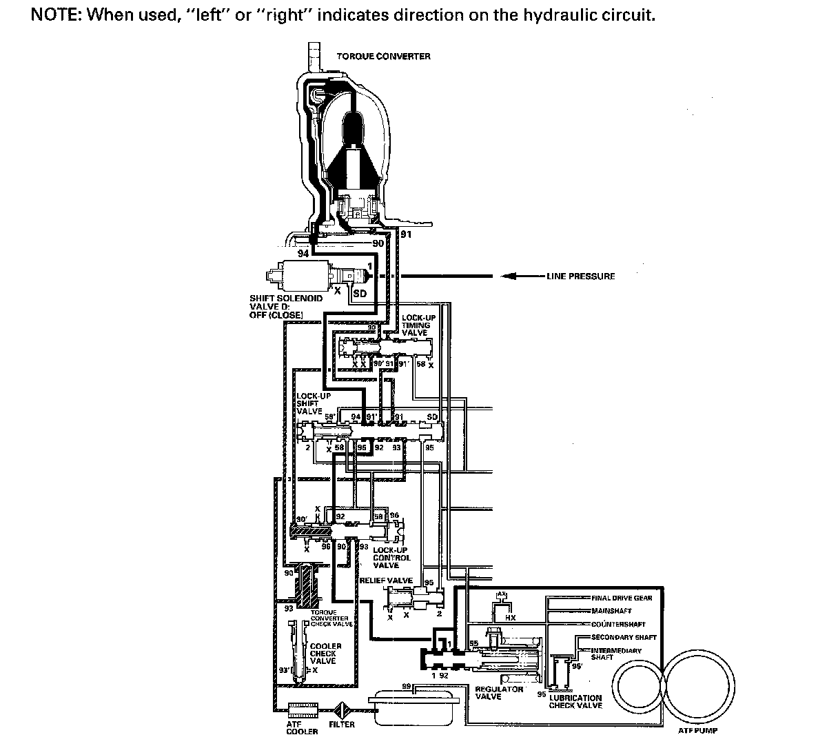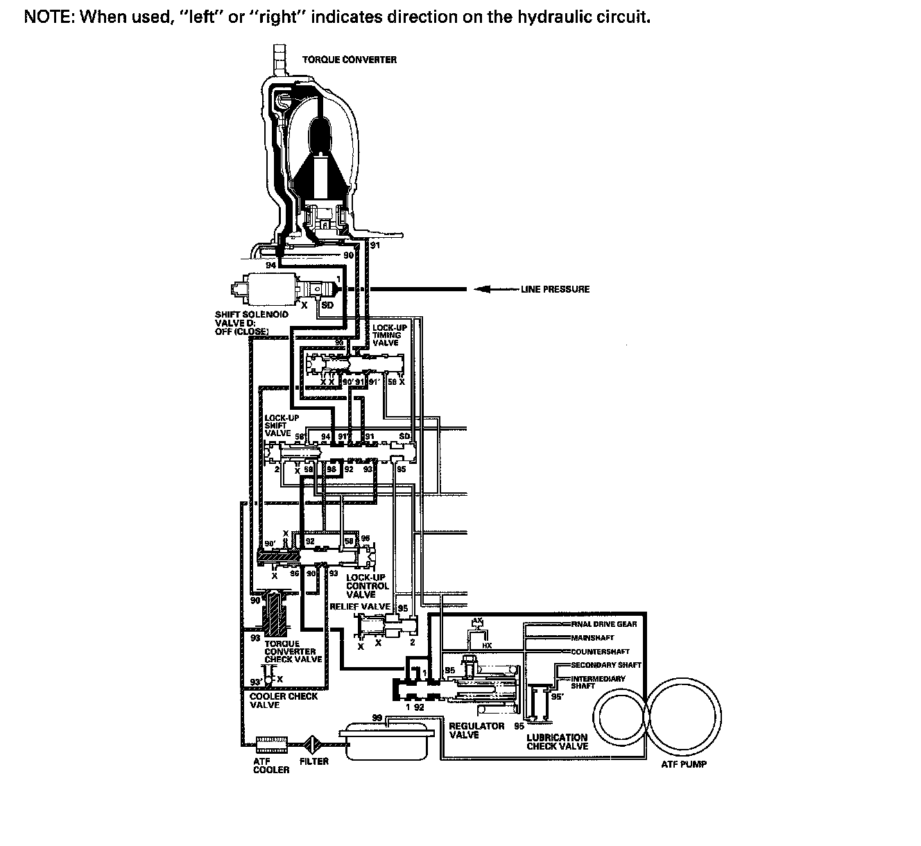 The PCM commands shift solenoid valve D to remain OFF, and shift solenoid valve D covers the port of shift solenoid valve D pressure (SD) to the lock-up shift valve. The lock-up shift valve is in the right side, and uncovers the port leading torque converter pressure (92) to the left side of the torque converter. Torque converter pressure (92) from regulator valve becomes torque converter pressure (94) at the lock-up shift valve, and enters into the left side of the torque converter to disengage the torque converter clutch. The torque converter clutch is OFF.