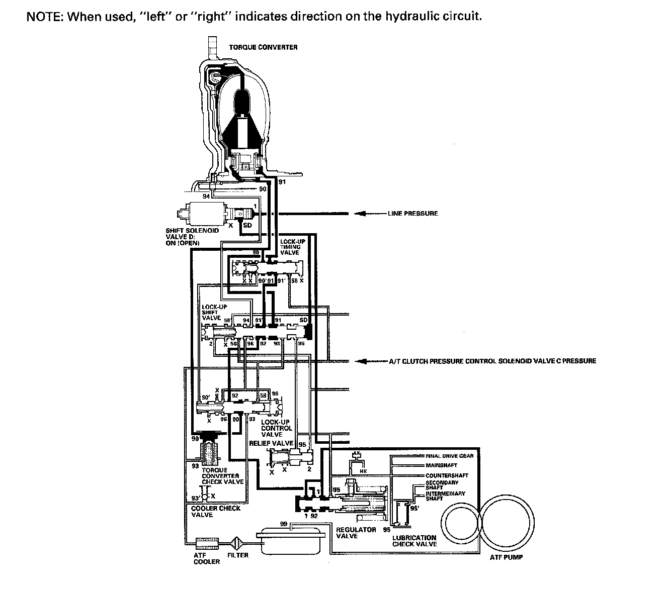 When the vehicle speed further increases, the PCM controls A/T clutch pressure control solenoid valve C to increase A/T clutch pressure control solenoid valve C pressure (58). A/T clutch pressure control solenoid valve C pressure (58) is applied to the lock-up control valve and lock-up timing valve, and the lock-up control valve and lock-up timing valve are moved to the left side. Torque converter pressure (94) from the left side of the torque converter releases at the lock-up control valve, and lock-up timing valve uncovers the port of torque converter pressure (91) leading to the right side of the torque converter. Torque converter back pressure is released fully, and torque converter clutch is engaged fully.
