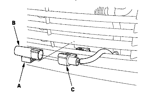 Outside Air Temperature Sensor Replacement1. Lift the tab (A) to release the lock, then remove the outside air temperature sensor (B) from the back of the front bumper. Disconnect the 2P connector (C) from the outside air temperature sensor.