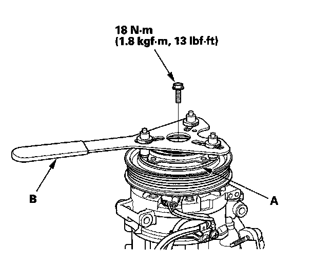 1. Remove the center bolt while holding the pressure plate (A) with a commercially available A/C clutch holder (B).